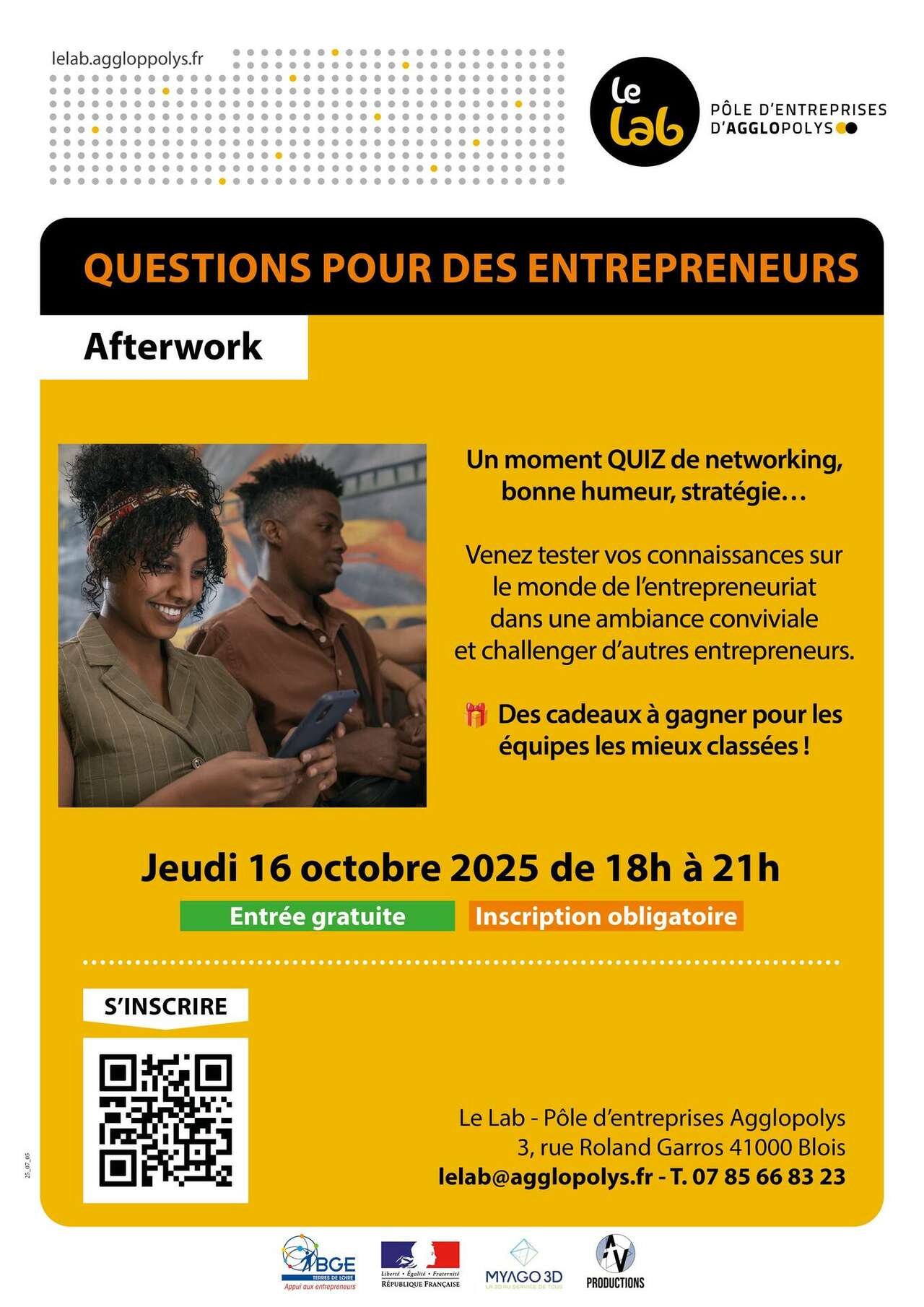 Venez tester vos connaissances sur le monde de l’entrepreneuriat dans une ambiance conviviale et challenger d’autres entrepreneurs.Des cadeaux concoctés par nos partenaires - Myago 3D et AV Productions - à gagner pour les équipes les mieux classées ! Date : Jeudi 16 octobre Date : 18h-21h Lieu : Lab 1 - 3 rue Roland-Garros - 41000 Blois Inscription gratuite : https://forms.gle/kfAtm2KDkrXfW3nJA